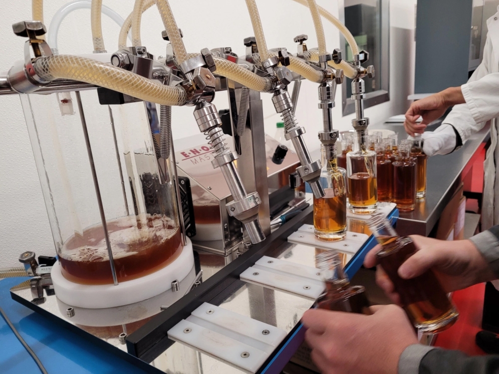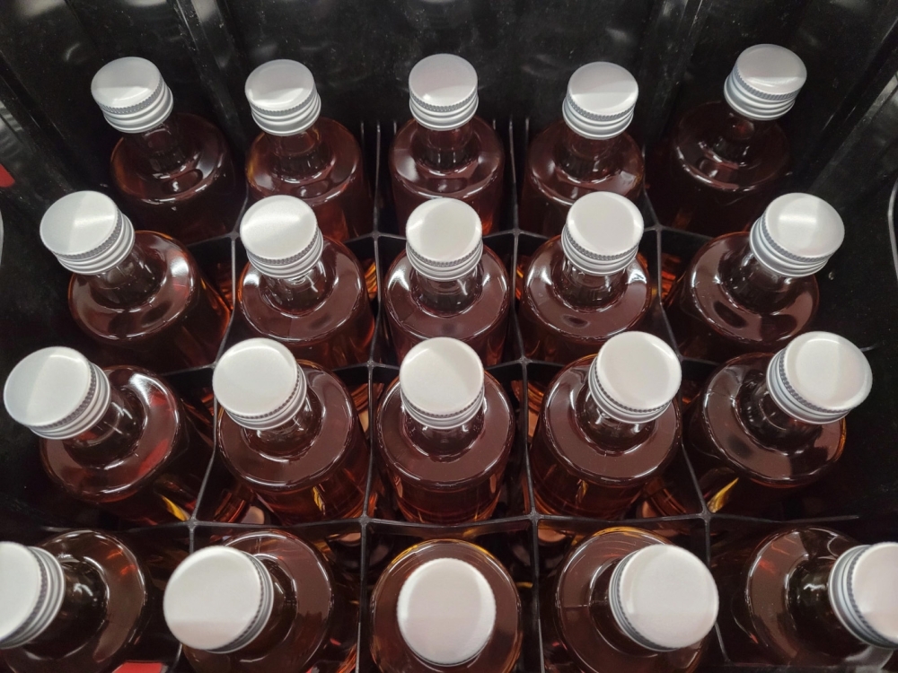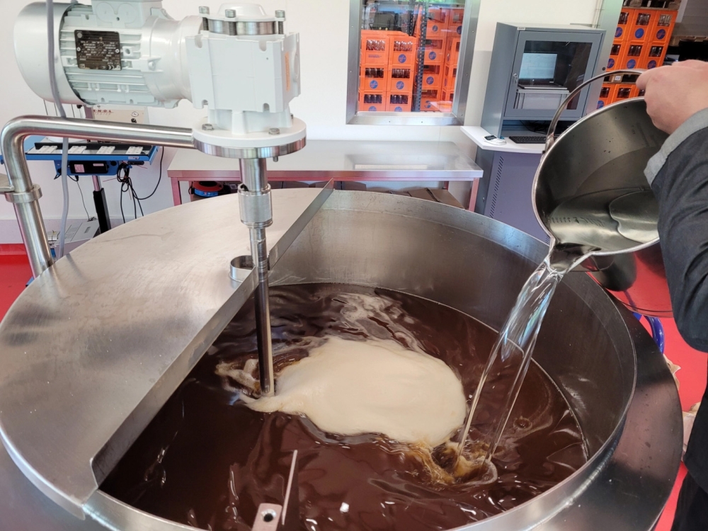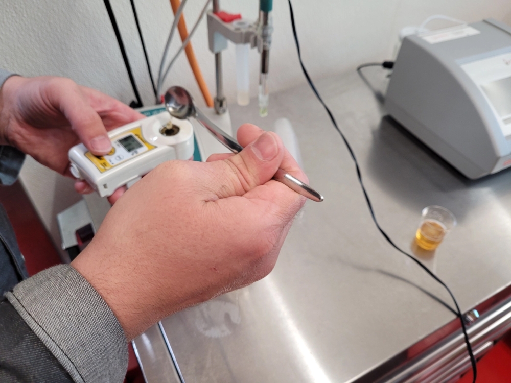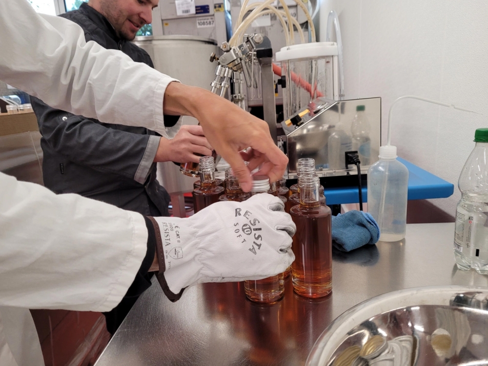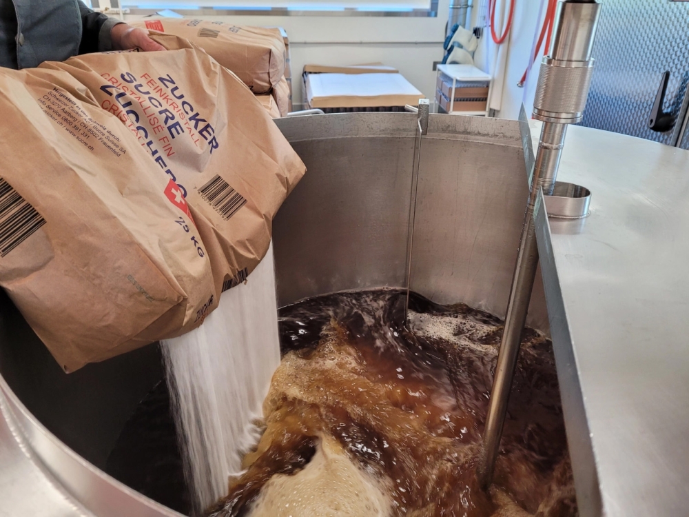 Ist der Zucker aufgelöst und alles gut durchmischt, wird die Qualität des Sirups überprüft. Dazu gehört eine Degustation vom Manufaktur-Team. Mindestens zwei erfahrene Gaumen probieren beherzt einen Schluck: «Isch er so guet wie immer? Stimmt alles?». Perfekt! Auch Zucker- und Säuregehalt werden mit Hilfe einer Maschine überprüft – wir wollen nichts dem Zufall überlassen. Wenn alles passt, wird abgefüllt.
