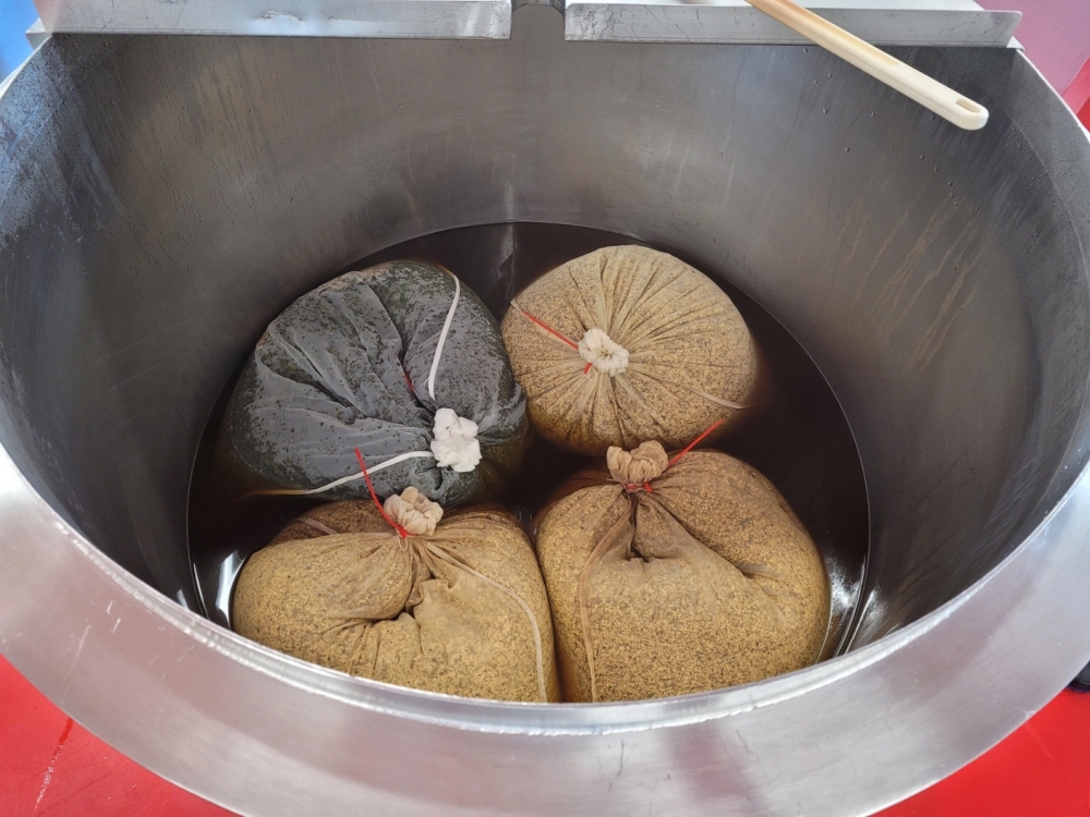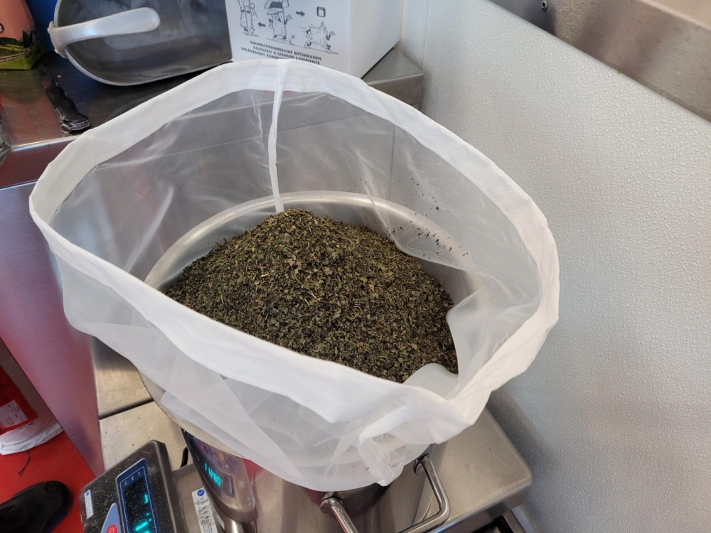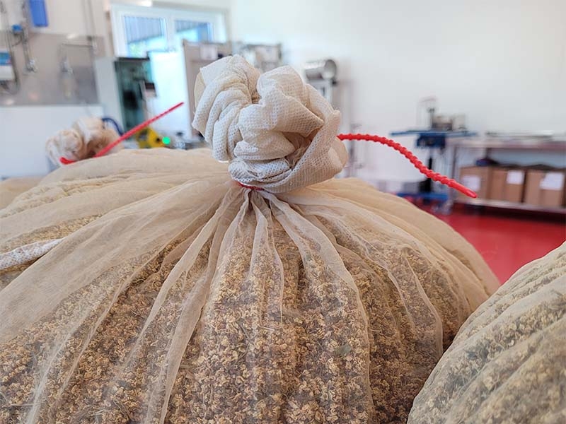 Als erstes werden die Holunderblüten und Melissenblätter, geballte Appenzeller Kräuter- und Blütenkraft, in Stoffsäcke abgewogen. Im heissen Wasser ruhen nun sie nun eine Weile und lösen die gewünschten Geschmacksstoffe. Nach der Ziehzeit werden die Stoffsäcke über dem Auszug schonend abgetropft. Schweizer Zucker und der Alpenkräuter Extrakt, unser Kräuterboden aus acht heimischen Kräutern, werden dazu gemischt.