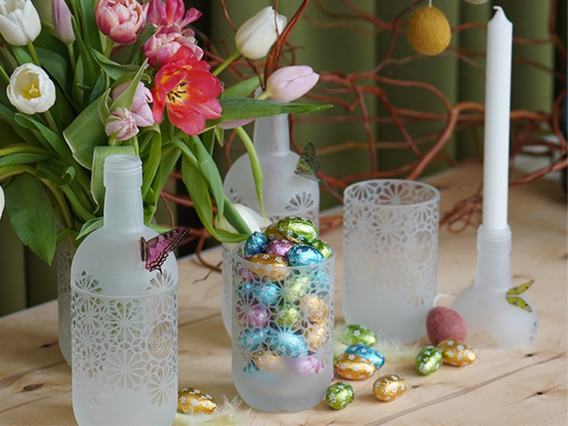 Zu grosszügig kalkuliert, standen wir einem Vorrat bedruckter Glasflaschen gegenüber, dem wir mit Fantasie und Kreativität, gemeinsam mit der Arbeitsintegration Winterthur, ein zweites Leben eingehaucht haben. Durch Schleifen und Bearbeiten entstanden zwei hübsche, vielseitig verwendbare Gefässe – bereit, mit Ihren Ideen gefüllt zu werden.