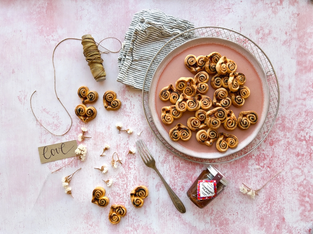 - Den Teig in 1 cm breite Stücke schneiden und auf ein Backblech setzen. Mit einer Gabel Herzen formen. Die Spitzen mit Daumen und Zeigefinger zusammendrücken.