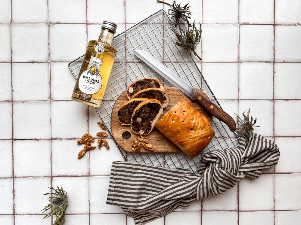 1. Die Dörrbirnen, Nüsse und Feigen fein hacken, in eine Schüssel zusammen mit den Rosinen geben und über Nacht mit dem Williams stehen lassen.