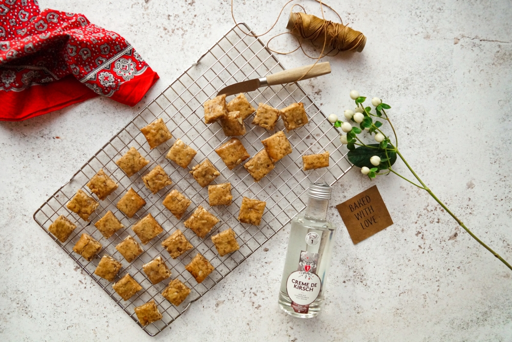 - Im vorgeheizten Ofen bei 220 °C für ca. 15 Minuten backen, Glasur aus Puderzucker und Crème de Kirsch mischen und auf dem Teig verteilen. Sofort den Teig in Quadrate schneiden, auskühlen lassen.