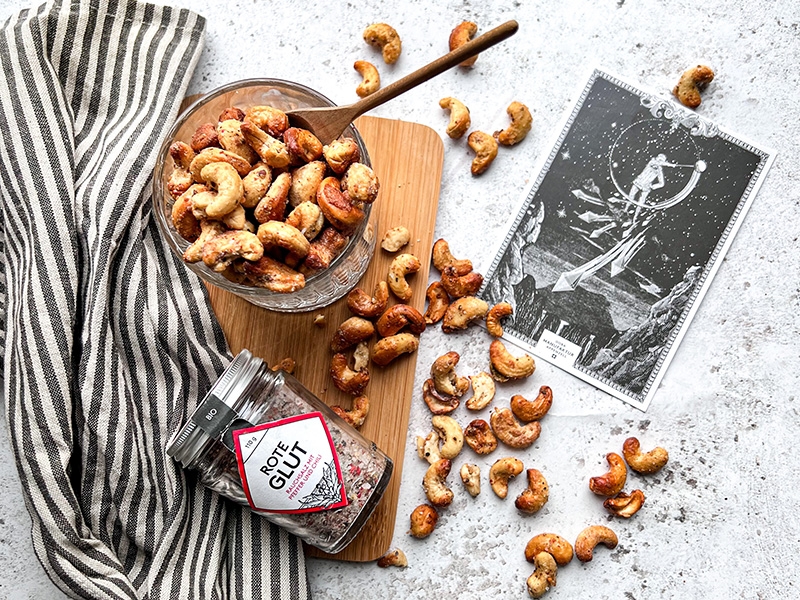 - Das Gewürzsalz Rote Glut mit dem Mörser fein mahlen. Anschliessend das Eiweiss mit dem Honig vermengen, Gewürzsalz beigeben und über die Cashewnüsse giessen.