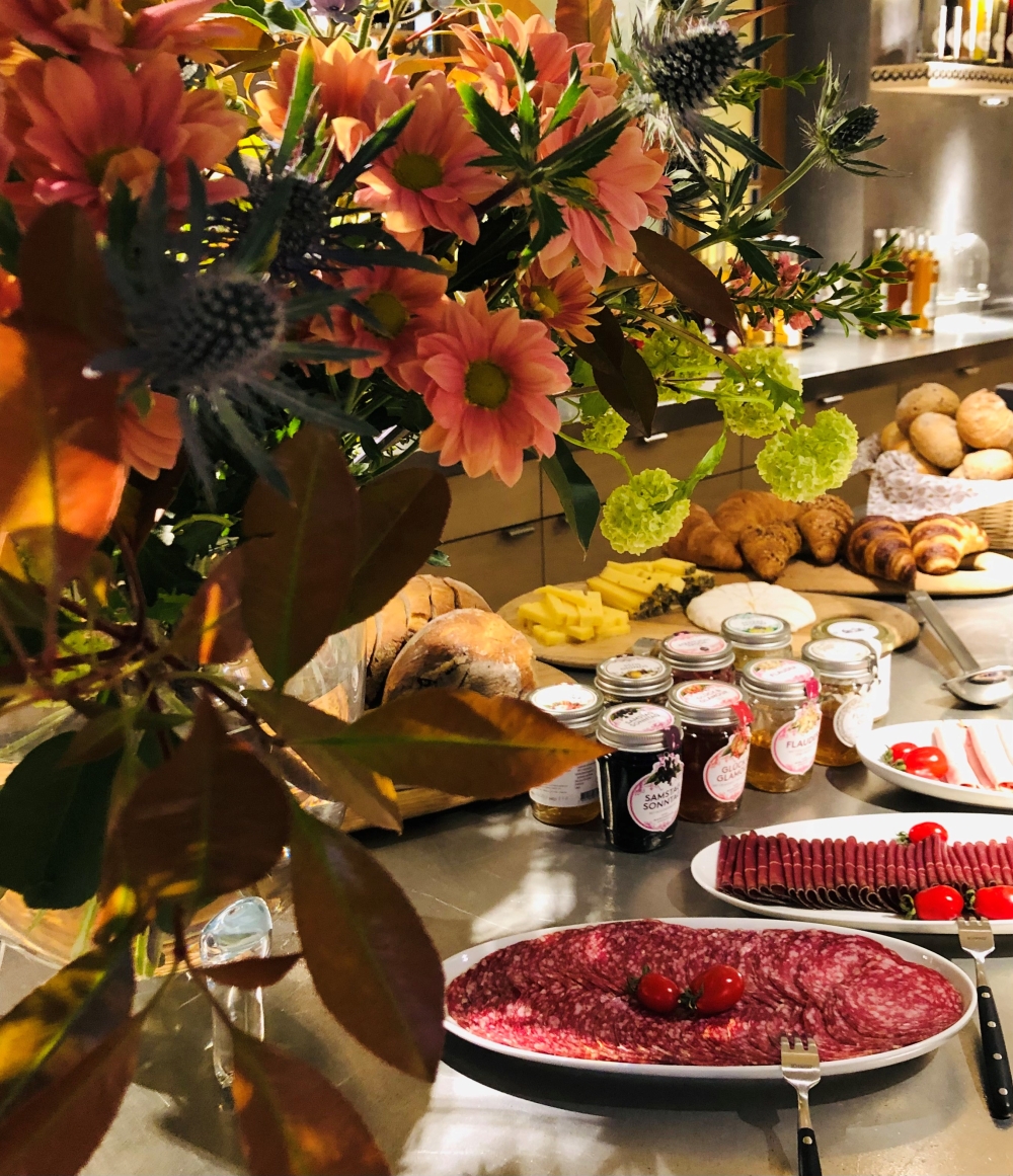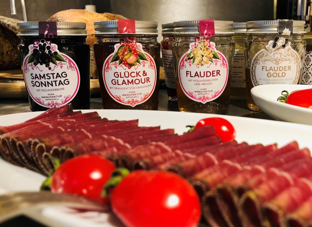 Das reichhaltige Frühstücksangebot wird von unseren hausgemachten Produkten aus der Goba Manufaktur und einem Glas Prosecco begleitet.